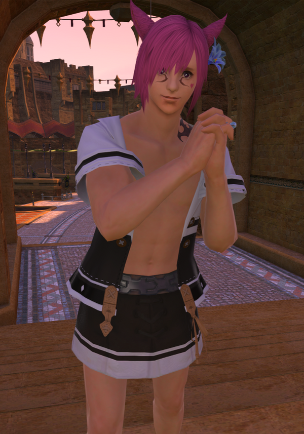 Being yet another thirsty gay catboy, Ash'leytai can be flirty, especially with those he knows. (He's also a total slut, but that's neither here nor there.) Many people call Miqo'te cats (I just did!), but Ash'leytai takes exception to this. He insists he's a dog! This, however, is betrayed by his cartoonishly cat-like speech quirks, often ascending into high-pitched speech punctuated by nyaa's—especially when excited/anxious/scared.